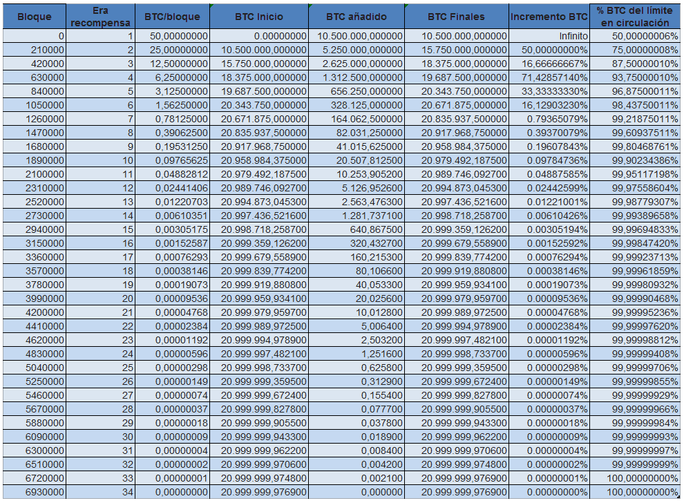 Cronograma de emisión de Bitcoin: recompensas, halvings y oferta acumulada.