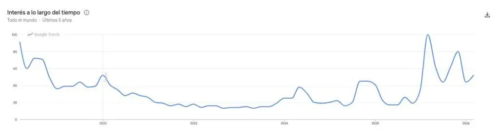 Las búsquedas globales del término “comprar bitcoin” registran su punto más alto en cinco años, según Google Trends, alcanzando niveles no vistos desde el auge del mercado a mediados de 2025. Este aumento refleja una creciente curiosidad y participación del público general, un patrón que en ciclos anteriores ha anticipado la llegada de nuevo capital al mercado y una mayor liquidez en las operaciones al contado.