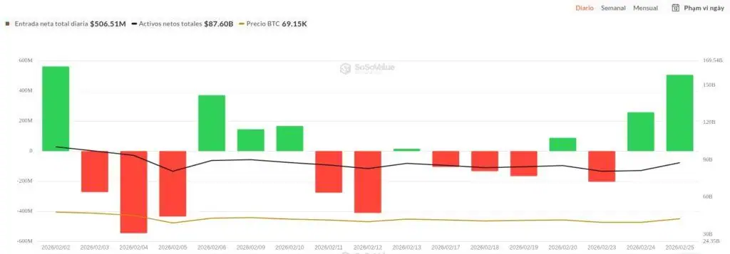 Uno de los elementos más decisivos proviene del aumento de la actividad en los Fondos Cotizados en Bolsa (ETF) de Bitcoin al contado en Estados Unidos. Los datos recientes muestran entradas netas por 506,6 millones de dólares el 26 de febrero, con un papel protagónico del fondo IBIT de BlackRock, que incorporó 4.309 BTC, valorados en alrededor de 296,75 millones de dólares en una sola jornada. Este ritmo de compras institucionales reduce la oferta disponible en circulación y genera una presión alcista que se refleja directamente en la cotización de la criptomoneda.