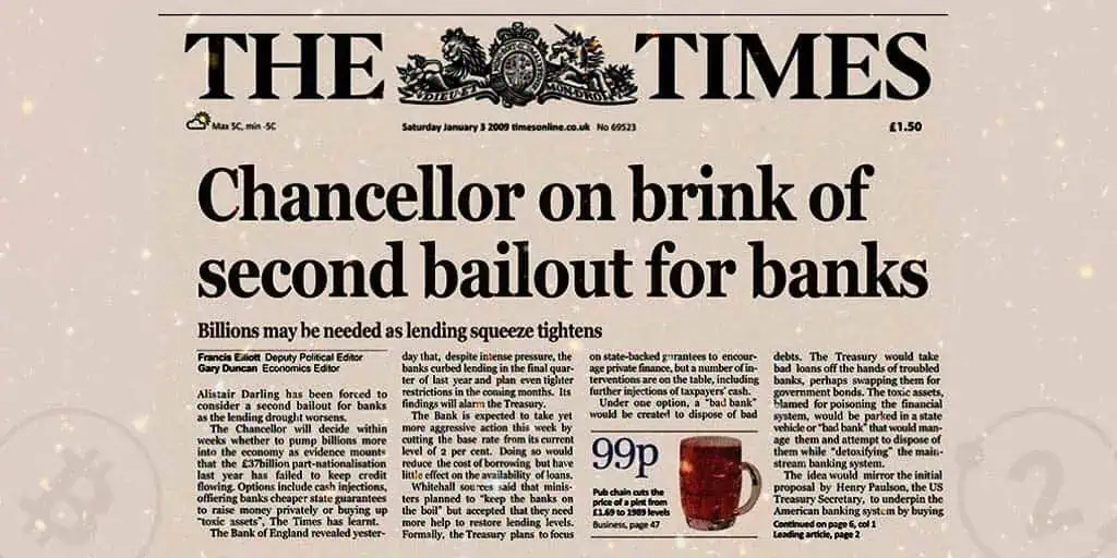 Dentro del primer bloque de Bitcoin, minado aquel día, Satoshi Nakamoto decidió incluir un texto específico que servía como prueba del momento exacto del lanzamiento de la red y como una declaración de intenciones.