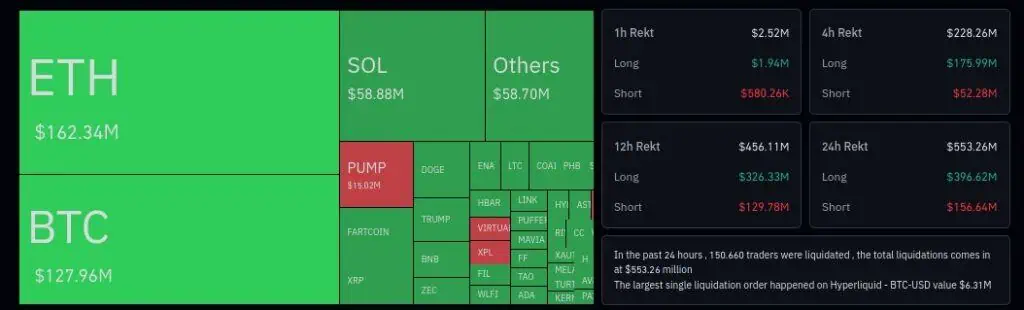En promedio, las principales criptomonedas del mercado han experimentado una corrección del 3% en las últimas 24 horas. Aunque esta caída es leve, las liquidaciones ascienden a 553 millones de dólares, al momento de escribir este artículo, según los datos consultados en la plataforma de análisis Coinglass.