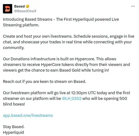 El anuncio oficial de Base Streams se realizó a través de una publicación en X, donde los desarrolladores presentaron la iniciativa como “la primera plataforma de transmisión en vivo impulsada por Hyperliquid”.