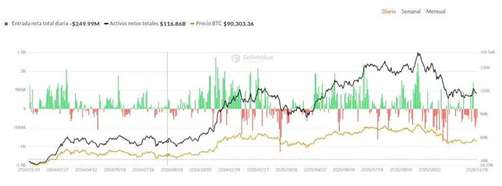 El contraste entre Bitcoin y el oro es contundente. Los datos recientes consultados en la plataforma Farside Investors, y compartidos por Bitwise Asset Management, confirmaron en una publicación en X que los fondos cotizados (ETFs) de Bitcoin han reunido cerca de $57.000 millones de dólares en entradas netas durante sus dos primeros años, desde enero de 2024 hasta enero de 2026.