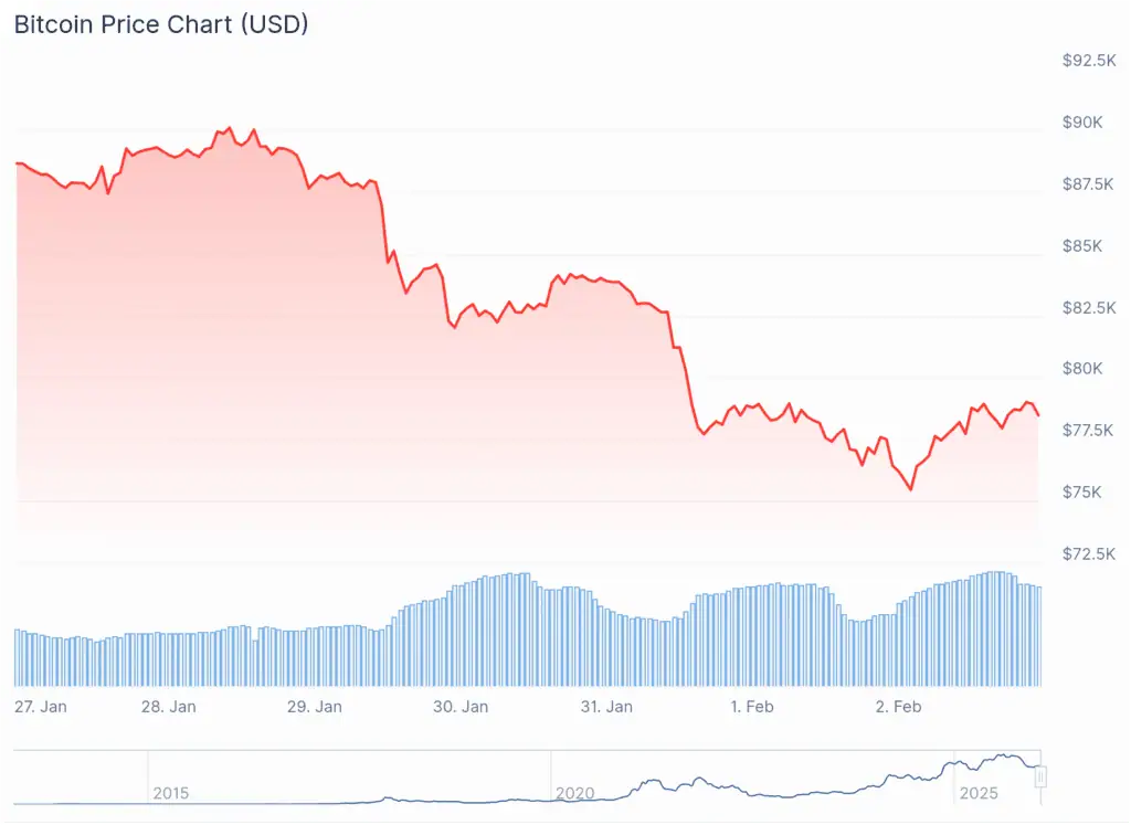 El precio de Bitcoin cayó a 78.000 dólares tras las tensiones geopolíticas y el cierre temporal de EE. UU., desencadenando 2.500 millones de dólares en liquidaciones en el mercado.