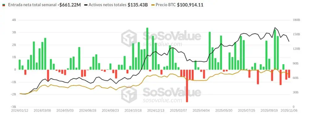 Los ETF al contado de Bitcoin registraron salidas netas por 488,4 millones de dólares, según datos consultados en la plataforma de Soso Value. Esta cifra se suma a una reducción superior a los 5.000 millones de dólares en los activos bajo gestión de estos fondos cotizados desde principios de octubre.