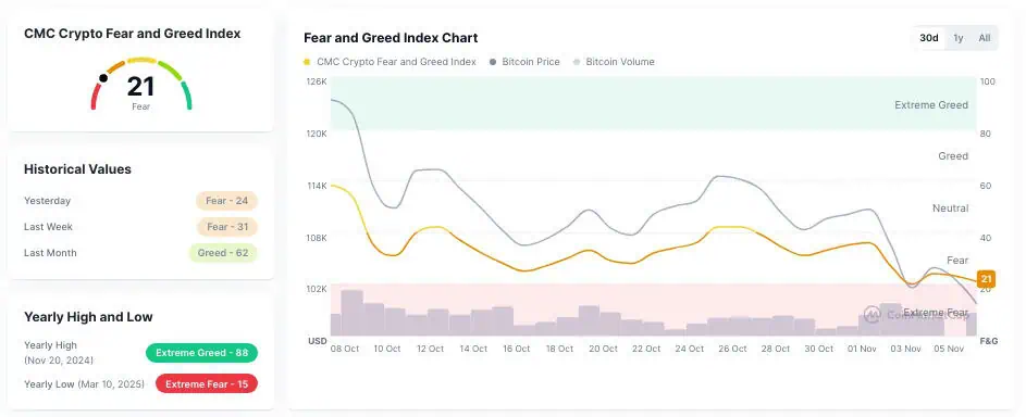 En medio de la corrección actual de precios, el índice de miedo y codicia cripto se ubica en 21 puntos, en zona de “miedo”, según el panel de CoinMarketCap. Este indicador, que combina métricas de volatilidad, volumen, redes sociales y dominancia de mercado, refleja una percepción negativa que puede amplificar movimientos técnicos. En este contexto, los analistas vigilan de cerca el nivel de los 98.000. Una ruptura sostenida de este nivel podría activar liquidaciones apalancadas similares a las del pasado 10 de octubre, cuando se superaron los 19.000 millones de dólares en posiciones cerradas.
