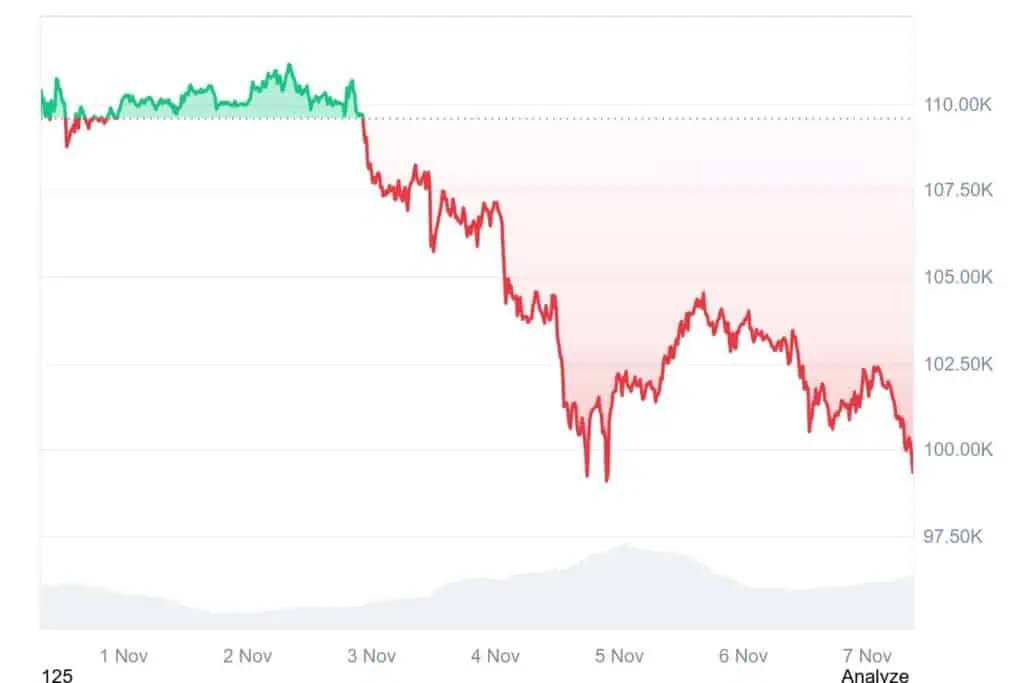 Bitcoin retrocedió un 3,06% en las últimas 24 horas, cotizando en 99.679 dólares, al momento de escribir este artículo, y profundizando una caída semanal del 9,55%.