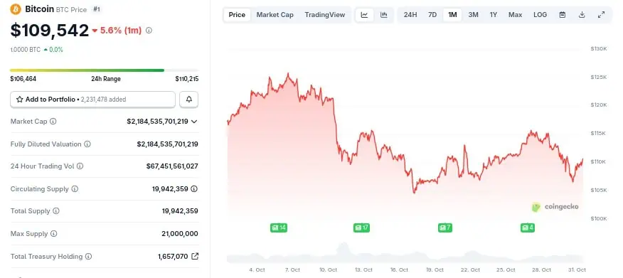 Bitcoin está cerrando este mes de octubre con una caída del 4,8%, situándose en torno a los 109.000 dólares. Este retroceso en el precio de la criptomoneda líder marca su primera pérdida mensual en siete años y el peor desempeño para octubre desde 2014.