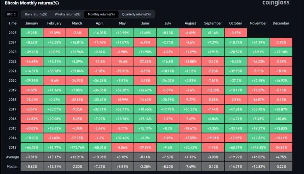 El retroceso de Bitcoin este mes rompe con una tendencia histórica que había convertido a octubre en uno de los meses más sólidos para la criptomoneda. Apodado “Uptober” por su consistencia alcista, octubre ha ofrecido una rentabilidad media del 19,9% desde 2013, según datos de CoinGlass. La última vez que BTC registró pérdidas en este mes fue en 2018, con una caída del 3,8%. Este año, sin embargo, la corrección alcanza el 4,8%.