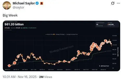 Por su parte, Michael Saylor continúa profundizando su estrategia de acumulación de BTC. A través de Strategy, ha reiterado su compromiso con Bitcoin como activo de reserva. Recientemente, compartió en redes sociales una actualización del gráfico de Bitcoin Tracker, herramienta que muestra la evolución de las compras institucionales de BTC, destacando que su estrategia sigue activa incluso en momentos de retroceso del mercado.