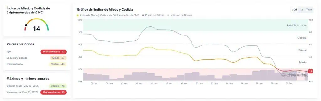 No obstante, el Índice de Miedo y Codicia (Fear & Greed Index) se mantiene en un nivel alarmante de 14 sobre 100, lo que categoriza el sentimiento actual como de «pánico extremo».