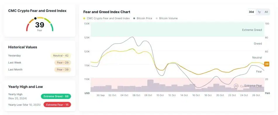 Si los gráficos de precios muestran qué sucedió, los índices de sentimiento explican cómo se sienten los participantes del mercado. El «Crypto Fear and Greed Index», un indicador compilado por CoinMarketCap que analiza el estado de ánimo colectivo, ofrece un diagnóstico claro: el miedo ha regresado.