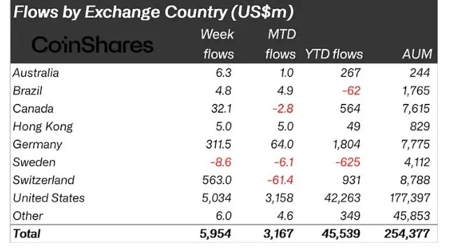 Opera ETH aquí y aprovecha el crecimiento institucionalAdemás de Estados Unidos, que lideró con 5.000 millones de dólares en entradas, otros mercados también mostraron señales positivas. Suiza alcanzó un nuevo récord en flujos con 563 millones de dólares y Alemania mostró su segunda mayor cifra semanal con 312 millones de dólares, destacando el crecimiento global del interés inversionista en activos digitales.