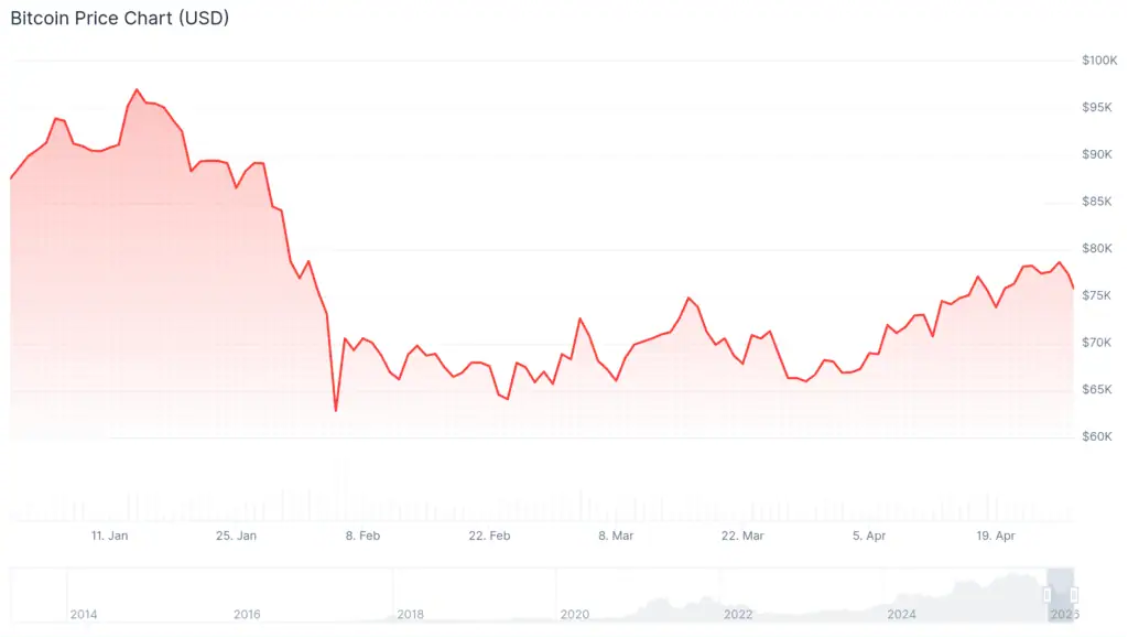 Actualmente, Bitcoin se encuentra en una fase de incertidumbre técnica, cotizando por debajo de niveles de resistencia clave como los $80.000 y manteniéndose por debajo de su promedio móvil de 365 días, situado cerca de los $87.000. Esta debilidad en el precio de la criptomoneda sugiere que el proceso de corrección iniciado tras los máximos locales no ha concluido