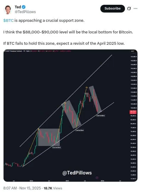 Este tipo de correcciones de precios no solo son esperadas, sino que muchas veces funcionan como mecanismos de limpieza del mercado: eliminan el exceso de apalancamiento, ajustan expectativas y permiten una acumulación más saludable a medio y largo plazo. En este contexto, varios analistas coinciden en que Bitcoin se está acercando a una zona de soporte técnico clave entre los 88.000 y 90.000 dólares. El analista cripto Ted Pillows dijo en X que si la cripto líder logra mantenerse en ese rango, podría marcar un mínimo local antes de una nueva fase de recuperación. Si no, el mercado podría volver a testear los mínimos vistos el pasado mes de abril.