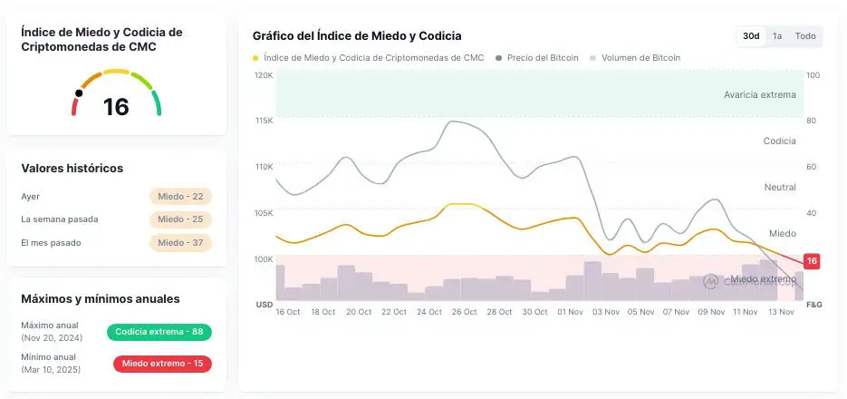 Pero, más allá de los gráficos, el sentimiento del mercado también ha cambiado drásticamente. El índice de miedo y codicia de Bitcoin cayó a 16, lo que indica “miedo extremo”. Este es el nivel más bajo desde la crisis ocasionada por la pandemia del COVID, y refleja una atmósfera de incertidumbre que, paradójicamente, suele ser terreno fértil para las oportunidades.