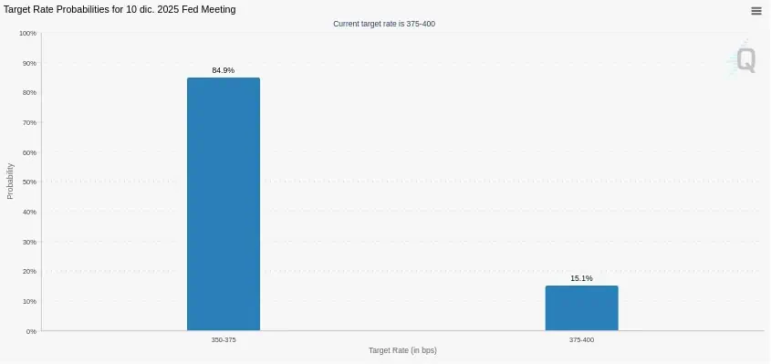 Si bien los flujos de capital aportan la gasolina, la Reserva Federal (Fed) parece estar ajustando el motor. El entorno macroeconómico ha sufrido un cambio de narrativa notable en apenas siete días. Los operadores e inversores han recalibrado sus expectativas respecto a la política monetaria de Estados Unidos para el cierre del año.