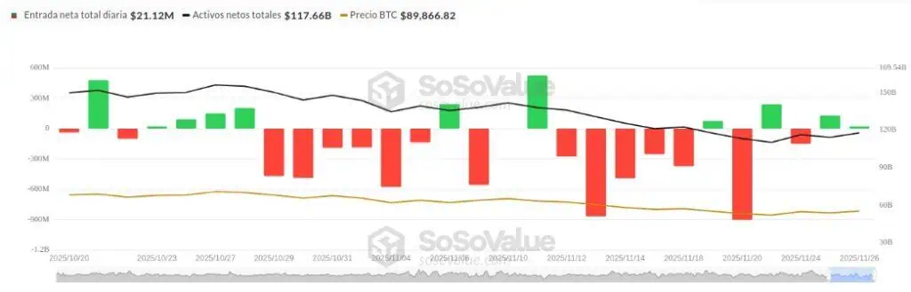 Uno de los termómetros más fiables para medir la salud del mercado actual es el comportamiento de los fondos cotizados en bolsa (ETFs) al contado en Estados Unidos. Tras un periodo de incertidumbre, los flujos de capital han regresado al terreno positivo. Los datos recientes confirman entradas netas por valor de 21,12 millones de dólares en estos productos financieros, en la última jornada, y más de 128 millones de dólares el día martes, una señal de que el apetito institucional por BTC no se ha saciado.