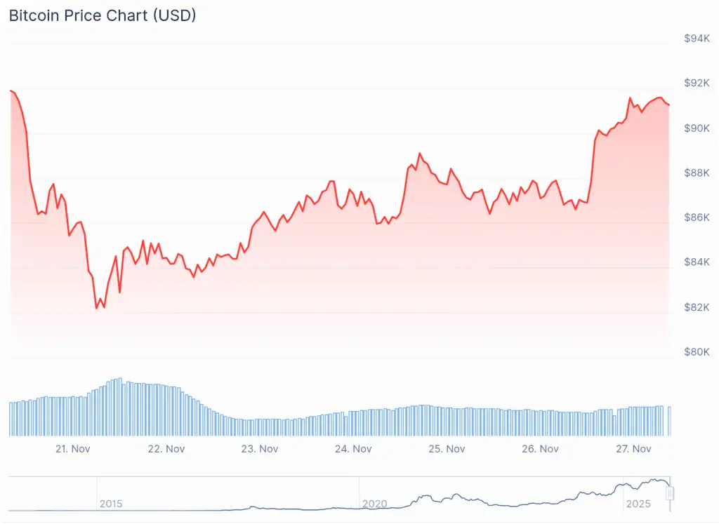 El precio de Bitcoin ronda los 91.000 dólares en el momento de esta edición, y la concentración de compras alrededor de este nivel muestra que las instituciones consideran valioso este rango de precios.