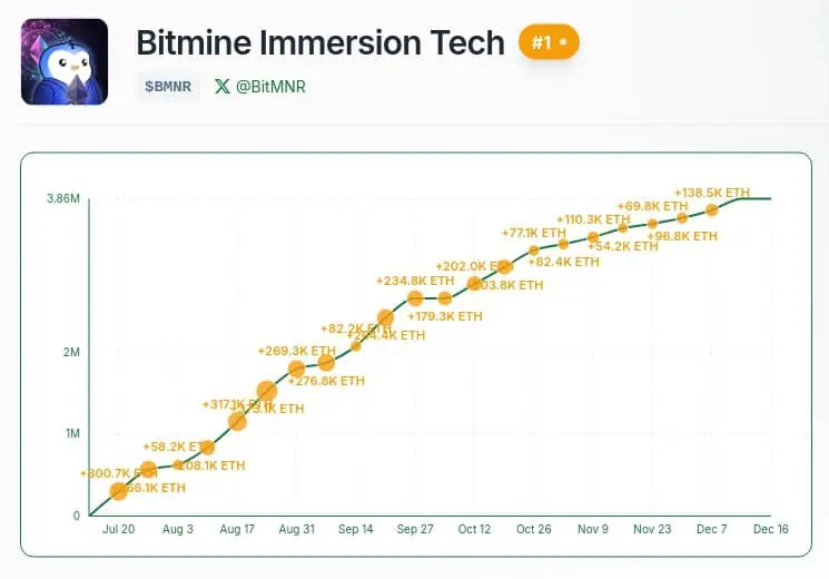 BitMine, cotizada en el NYSE, invirtió recientemente otros 321 millones de dólares en Ethereum a un precio promedio de 3.074 dólares por unidad y ahora acumula una reserva cada vez más cercana al 5% de la oferta mundial de ETH, tal como se lo ha propuesto la directiva de la compañía.