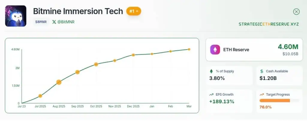 Bitmine ahora posee 4,73 millones de ETH, mientras gestiona alrededor de 3,1 millones en staking mediante MAVAN y se consolida como la mayor tesorería de Ethereum.