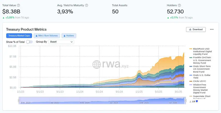 Por otro lado, el mercado ya ofrece señales de que la tokenización está escalando más allá de los experimentos. Los datos de la plataforma RWAxyz revelan que los bonos del Tesoro de Estados Unidos tokenizados superaron los 8.000 millones de dólares, una cifra que muestra cómo la liquidación en cadena empieza a consolidarse en activos financieros de gran volumen.