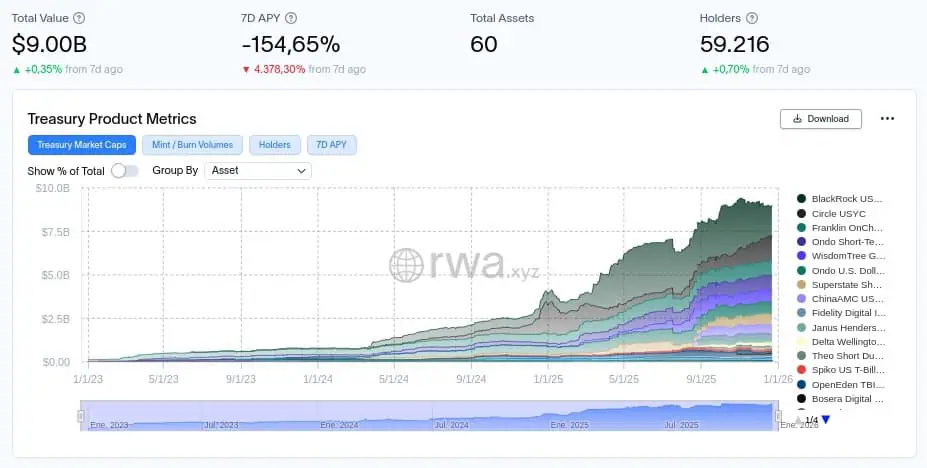 El mercado de deuda estadounidense en blockchain roza los 9.000 millones de dólares, impulsado por gigantes como BlackRock y la demanda de eficiencia en garantías financieras.