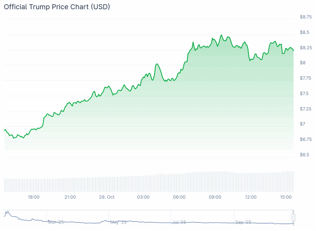 Mientras Bitcoin se ajusta a las nuevas condiciones macroeconómicas, una criptomoneda de perfil completamente distinto ha captado la atención del mercado. Se trata de TRUMP, una memecoin vinculada simbólicamente al presidente Donald Trump, que ha registrado un repunte del 20% en las últimas horas. Con un precio de 8,29 dólares y una capitalización de mercado de 166 millones de dólares, TRUMP lidera el rebote entre los activos digitales más negociados, según datos de CoinGecko.