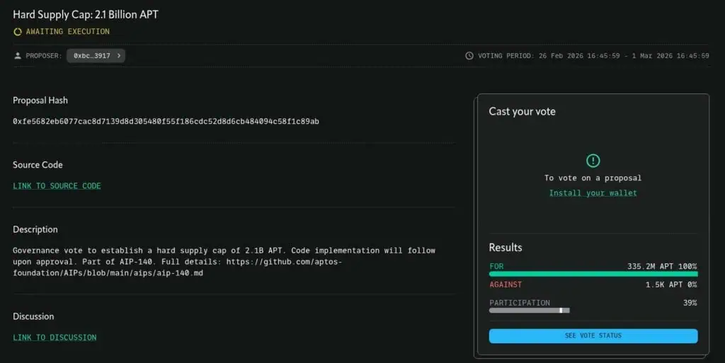 El cambio propuesto en la emisión del token APT obtuvo un respaldo masivo de 335,2 millones de APT a favor frente a solo 1.500 APT en contra. Según los datos de gobernanza del protocolo, la participación alcanzó el 39% del poder de voto, superando el umbral mínimo del 35% requerido para validar el proceso.