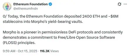 La Fundación Ethereum acaba de revelar una inversión significativa en el protocolo Morpho. El depósito incluye 2.400 ETH y aproximadamente 6 millones de dólares en stablecoins, destinados a las bóvedas de rendimiento del protocolo. Según la Fundación, esta acción forma parte de su política de tesorería y refleja su compromiso con el desarrollo de la infraestructura DeFi sin permiso, basada en principios de libertad y software libre de código abierto.