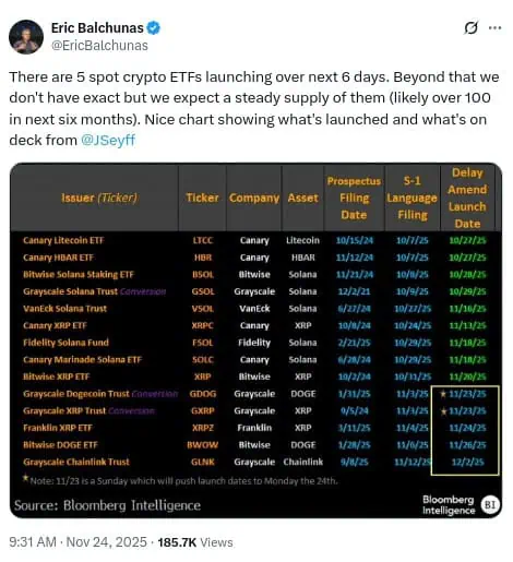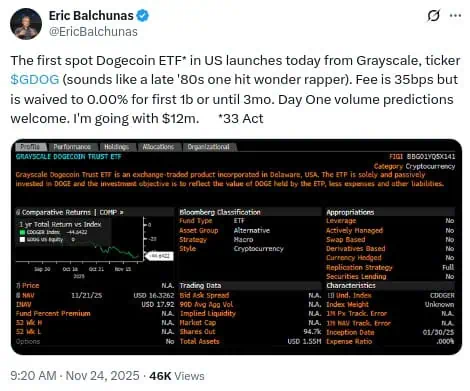 Más allá de Dogecoin, Balchunas también arrojó luz sobre un movimiento simultáneo que acompaña al lanzamiento de GDOG y BWOW. Según él, esta semana no solo está protagonizada por la memecoin, sino también por la consolidación de otros activos digitales de alto perfil. Junto a los ETFs de DOGE, el mercado recibió al Grayscale XRP Trust y al Franklin XRP ETF, ambos centrados en la criptomoneda de Ripple.