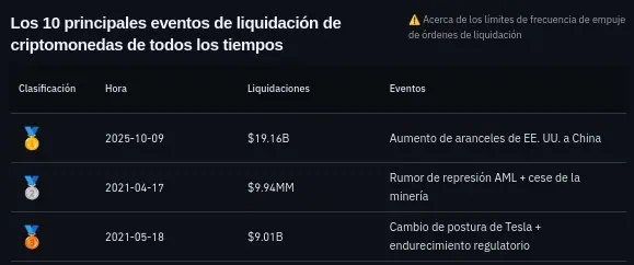 El 10 de octubre, este círculo vicioso se activó con una intensidad pocas veces vista. En cuestión de horas, las liquidaciones superaron los 19.000 millones de dólares, una cifra que, de acuerdo con datos de CoinGlass, casi duplicó los mayores episodios de 2021.
