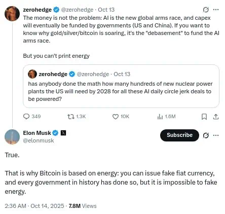 Su comentario, publicado en la red social en respuesta a una publicación realizada por ZeroHedge, subraya que “no se puede falsificar energía”, en referencia al mecanismo de prueba de trabajo que sustenta a Bitcoin, la cripto más capitalizada y la red blockchain más robusta del mundo.