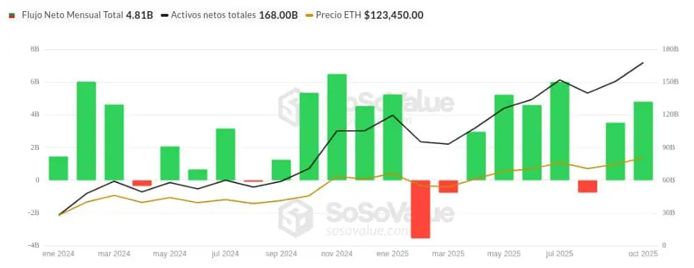 In September of this year, Bitcoin ETFs saw significant inflows, reaching $3.500 billion. So far in October, the capital flow attracted by these funds has already exceeded $4.800 billion, with BlackRock surpassing $80.000 billion in assets under management linked to the cryptocurrency. These figures not only reflect the interest of major financial players but also consolidate Bitcoin as an increasingly present asset in diversified portfolios.