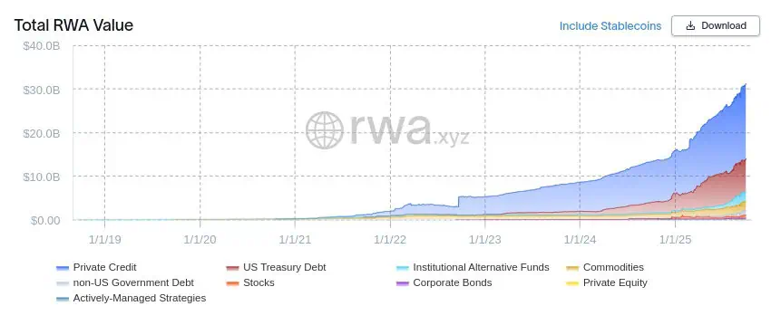 Los datos proporcionados por RWAxyz ilustran cómo el valor total de los activos tokenizados ha ido en aumento constante desde 2019, con una aceleración especialmente marcada a partir de 2021. La participación dominante del crédito privado tokenizado se visualiza claramente en el gráfico de la plataforma, mostrando que esta categoría no solo crece en volumen, sino que también acapara la mayor atención de inversores que buscan instrumentos con mayor rentabilidad relativa.