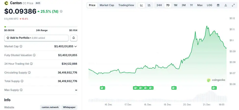 Canton Network leads the crypto market with a 25% increase after receiving regulatory approval from the SEC and new strategic institutional alliances.