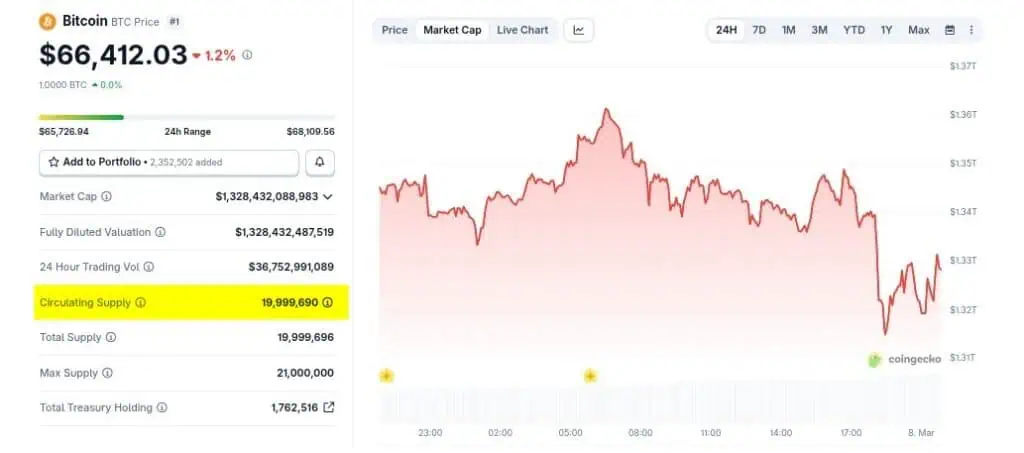 With a current price of $66.412 and a dominant presence in the global market—with a market capitalization exceeding $1,3 trillion—the leading cryptocurrency confirms that 95,2% of its total supply is now available. This milestone leaves just one million BTC pending issuancea minimum reserve that will be distributed in dribs and drabs over the next century.