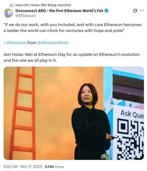 En Devconnect Argentina 2025, Hsiao-Wei Wang, codirectora ejecutiva de la Fundación Ethereum, presentó una metáfora que resume la esencia del proyecto: Ethereum es una “escalera interminable” construida por su comunidad.
