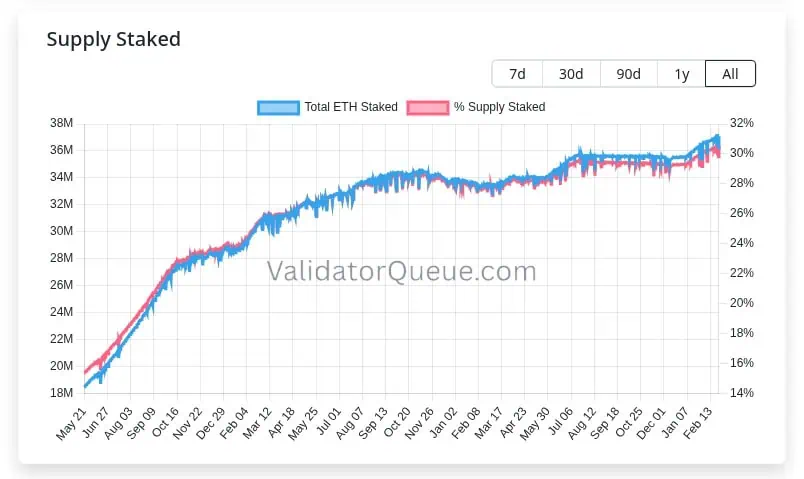 Ethereum registra un nuevo récord con más deel 30% de su suministro de ETH en staking.