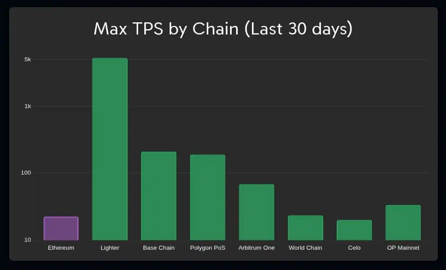 Lighter, un exchange descentralizado (DEX) construido sobre un rollup impulsado por tecnología de conocimiento cero (ZK), ha liderado gran parte de esta mejora gracias a la capacidad de procesar miles de transacciones de forma simultánea. En comparación, otras redes Layer 2 de Ethereum, como Base, mantienen un rango de entre 100 y 300 TPS, lo que, para Arkham, subraya la relevancia y el impacto decisivo que tienen las soluciones de segunda capa, especialmente aquellas basadas en tecnología ZK, en la expansión y eficiencia de la red.