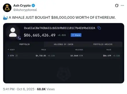 Las ballenas, esos grandes inversores capaces de influir en el mercado con un solo gesto, han vuelto a ser protagonistas en Ethereum. La última semana estuvo marcada por operaciones de alto impacto. Según las plataformas de análisis como Coinglass, el 5 de octubre, en apenas una hora, se liquidaron posiciones cortas por más de 80 millones de dólares, golpeando tanto a Bitcoin como a Ethereum.