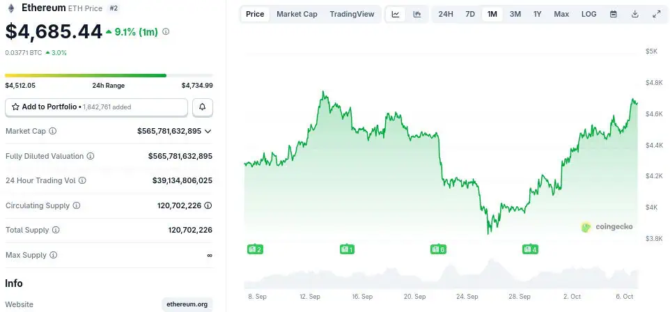 Ethereum (ETH) está tocando puertas que no visitaba desde su máximo histórico actual, registrado en agosto, cuando alcanzó los 4.946 dólares. Actualmente, el precio ronda los 4.680 dólares, un nivel que ha vuelto a encender el interés tanto de analistas técnicos como de inversores institucionales.