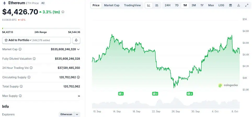 Los datos de CoinGecko muestran que Ethereum alcanzó un rango de entre $4.247 y $4.548 en las últimas 24 horas, con un volumen de negociación de más de $37.000 millones. La capitalización de mercado se sitúa en $535.000 millones, lo que refleja la magnitud del interés que sigue despertando el activo digital.