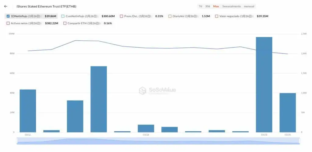 En su primera semana de cotización en el Nasdaq, el fondo ETHB acumuló 254 millones de dólares en activos bajo gestión (AUM). A la fecha de esta publicación, acumulan más de 380 millones de dólares, una cifra que evidencia una demanda latente en el mercado por instrumentos productivos respaldados por la mayor gestora de capitales del mundo, pese a que otros fondos de Ethereum con staking ya cotizaban en el mercado previo al lanzamiento de ETHB.
