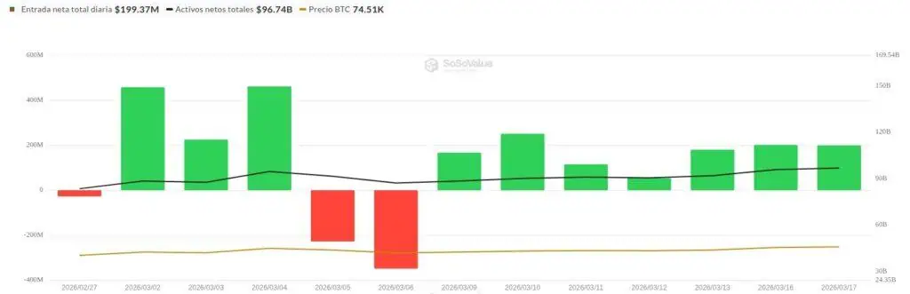 El sostenimiento del precio de Bitcoin sobre el nivel de los 70.000 dólares durante esta semana también ha sido influenciado por el flujo constante de capital que ingresa a través de los fondos cotizados en bolsa (ETFs) de Bitcoin.