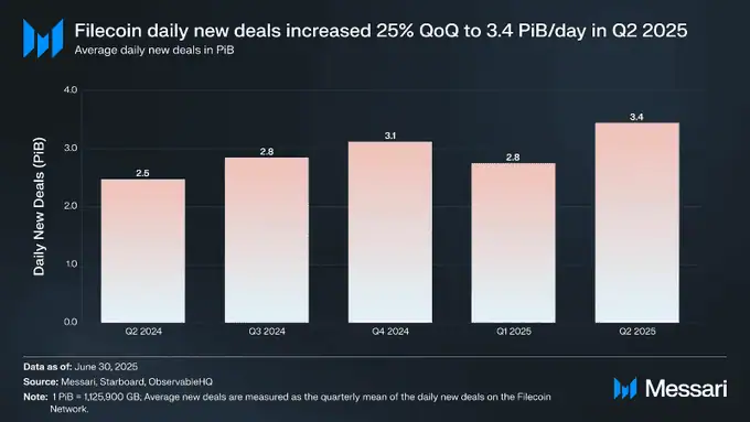 En el segundo trimestre de este año, Filecoin registró un crecimiento significativo en su actividad diaria, alcanzando un promedio de 3,4 PiB (Pebibytes) en nuevas ofertas de almacenamiento por día. Esto representa un aumento del 25% respecto al trimestre anterior, según datos recopilados por Messari.