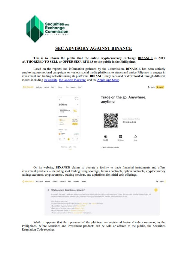 “El operador de la plataforma BINANCE NO ESTÁ REGISTRADO como sociedad anónima en Filipinas y FUNCIONA SIN LA LICENCIA Y/O LA AUTORIZACIÓN NECESARIAS para vender u ofrecer cualquier tipo de valores al público”, advirtió la SEC.