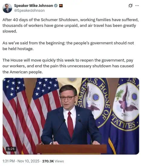 El presidente de la Cámara de Representantes, Mike Johnson, aunque se comprometió a actuar rápidamente para reabrir las agencias y pagar a los trabajadores, no tardó en calificar la situación como el «Cierre de Schumer».