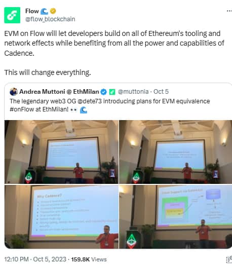 En el foro de la comunidad de Flow, Dieter Shirley, arquitecto jefe de la red blockchain, destacó que la equivalencia con EVM complementará el ecosistema de aplicaciones de Flow para hacerlo mucho más poderoso. Asimismo, la equivalencia con EVM servirá para expandir su ecosistema blockchain, permitiendo a los desarrolladores de Flow escribir contratos inteligentes utilizando Cadence para extender o añadir nuevas funcionalidades sobre los contratos inteligentes de Solidity con total componibilidad.
