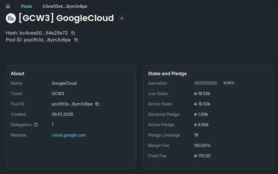 El análisis de los datos disponibles en la cadena de bloques ofrece una visión transparente del estado actual de esta operación. Según la información extraída del explorador Cexplorer, el nodo de Google Cloud fue dado de alta el 9 de enero y, al momento de redactar este informe, muestra métricas que corresponden a una fase de configuración y prueba inicial. Los registros indican que el nodo cuenta con una participación en vivo de 9.500 ADA y posee un único delegador registrado hasta la fecha.